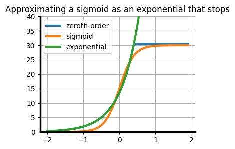 Exponential growth takes the mathematical form \(e^{rt}\) (r for rate, t for time), which has the nice symmetry of \(dP(t)/dt = rP(t)\). The sigmoid places a constraint on this exponential growth given by some carrying capacity \(K\) (for example, the population of deer in Yosemite park is upper bounded by the amount of shoots and berries available to eat). The rate of growth of the population \(\frac{dP}{dt}\) is \(rP(t)(1 - P(t)/K)\). Once \(P(t)=K\) this rate of growth will be zero. But as long as \(P(t)\) is well below \(K\), the \((1 - P(t)/K)\) term is basically 1, so growth looks exponential.